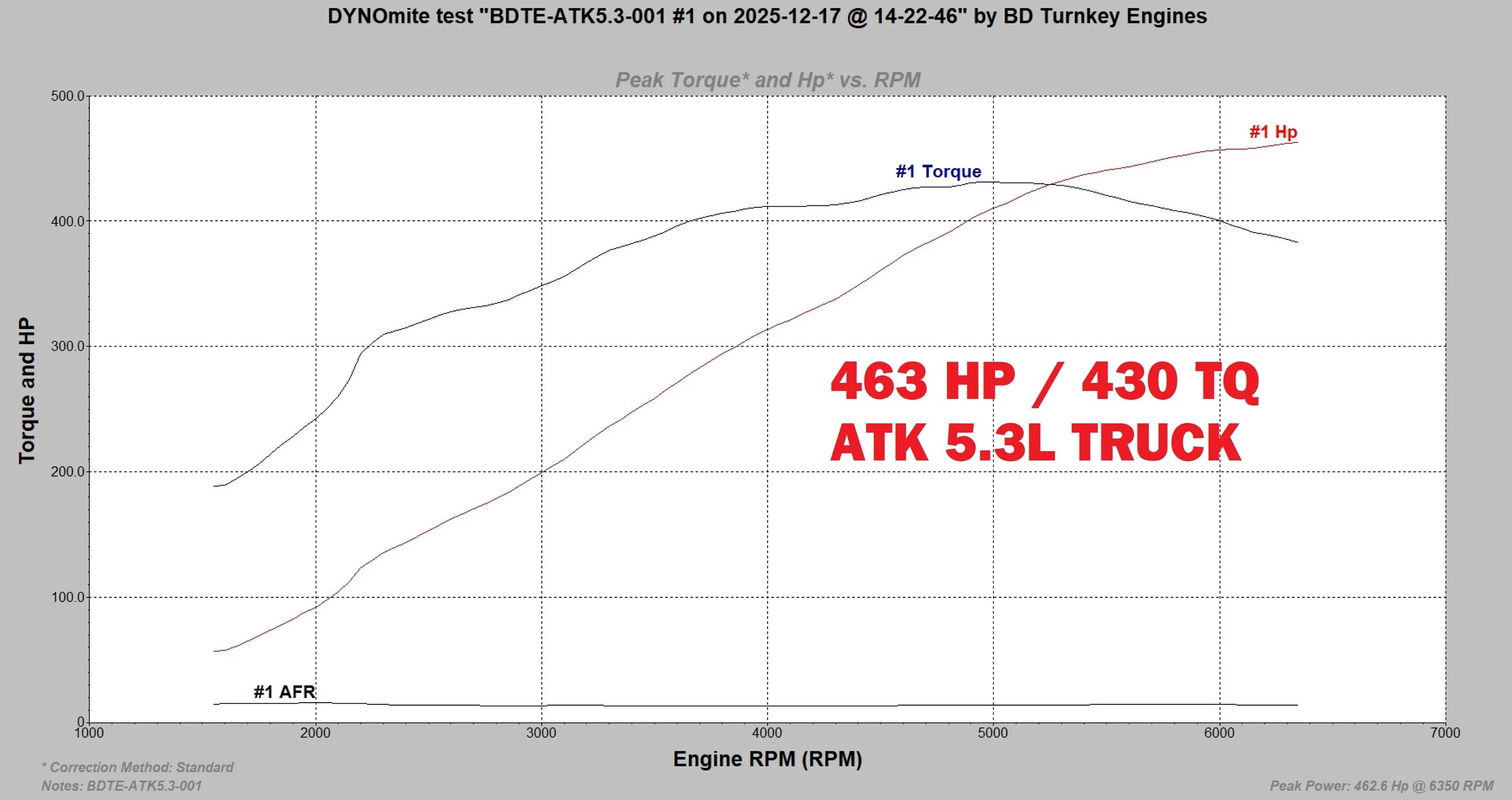 These ATK 5.3L remanufactured engines come with the LS6 (243 or 799) heads. With these high performance heads, the Gen4 Intake and a 92mm Throttle Body this engine has proven to meet or even exceed its advertised ratings of 450HP and 420TQ. Our initial Dyno Testing results came in at 463HP and 430TQ. https://www.summitracing.com/parts/sum-150153